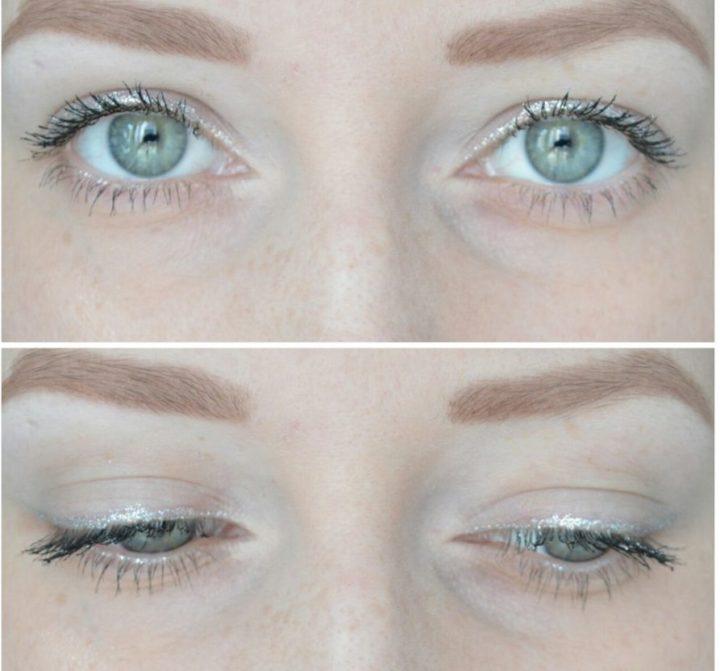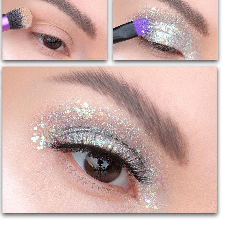 Pour les vacances, il vaut la peine de choisir des ombres à paupières argentées avec des paillettes, qui s’adapteront parfaitement à une base pré-préparée d’ombres nues mates.