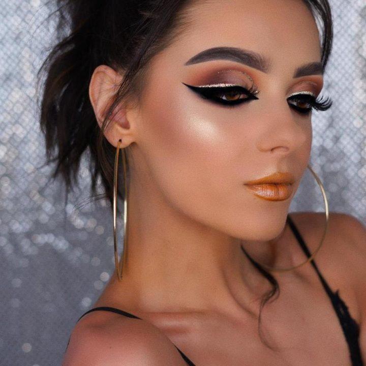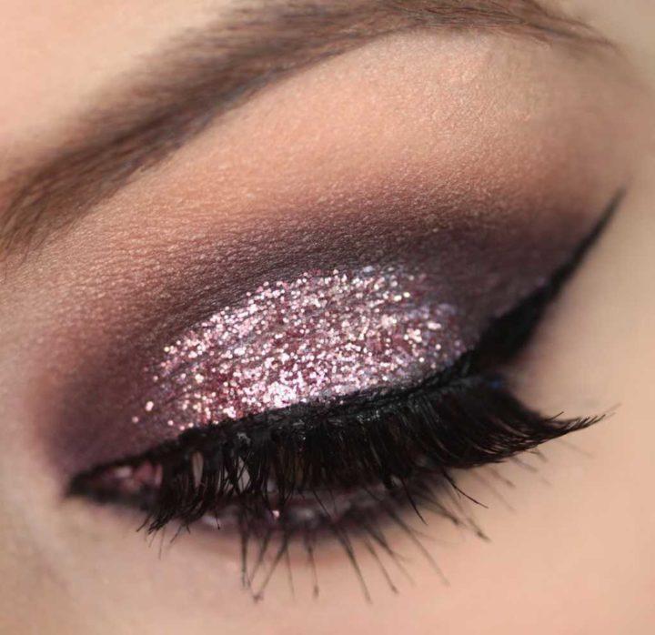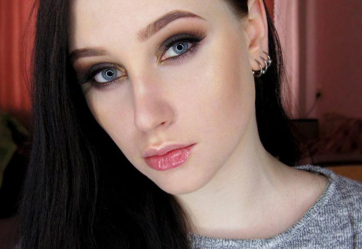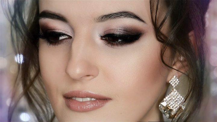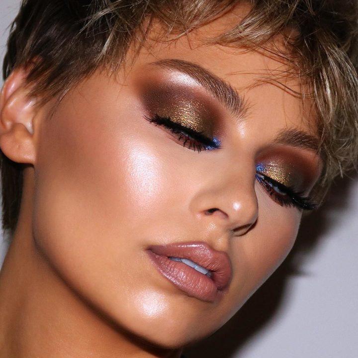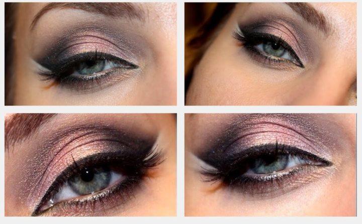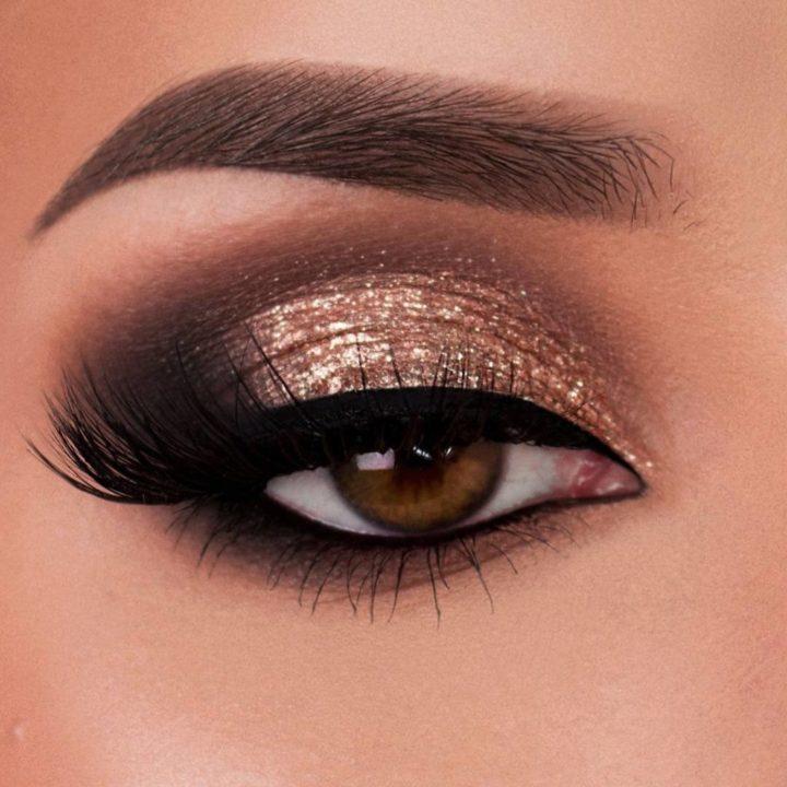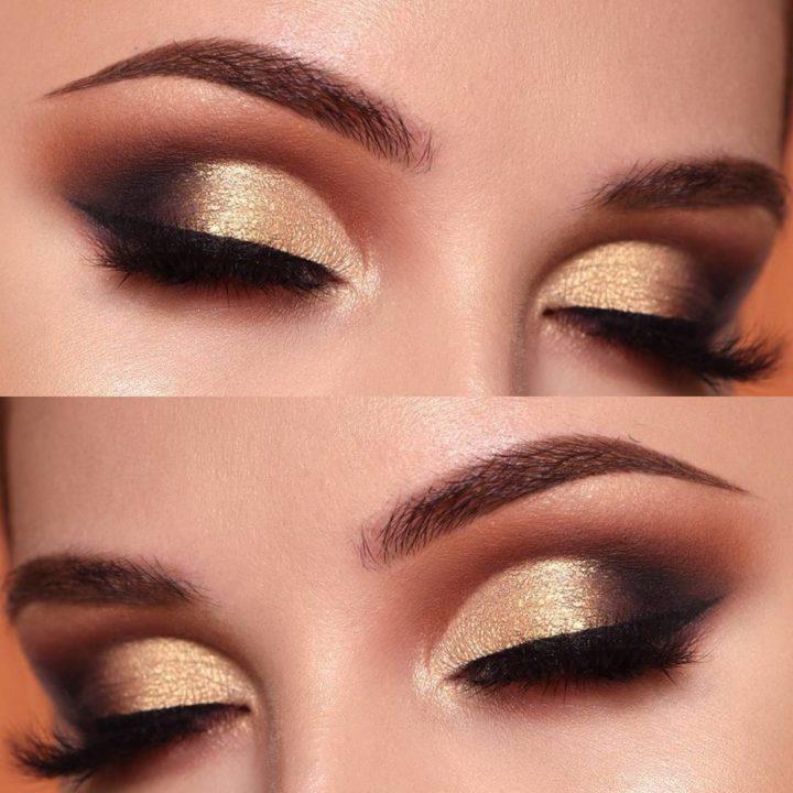 Le maquillage de fête peut être rendu très luxueux en utilisant une belle combinaison d’ombres à paupières dorées et brunes. La technique des aurores boréales sera appropriée ici, où le coin interne de l’œil est mis en évidence dans une nuance plus claire de brun, puis une nuance sombre suit.