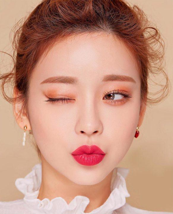 Les femmes coréennes réduisent toujours visuellement leurs lèvres. Et l’effet de « lèvres mordues » est considéré comme un chic particulier. Tracez le contour de vos lèvres avec un crayon blanc. Ensuite, appliquez la poudre sur vos lèvres et saupoudrez également le crayon lui-même. Appliquez un peu de brillant de baies au centre et fermez bien vos lèvres.