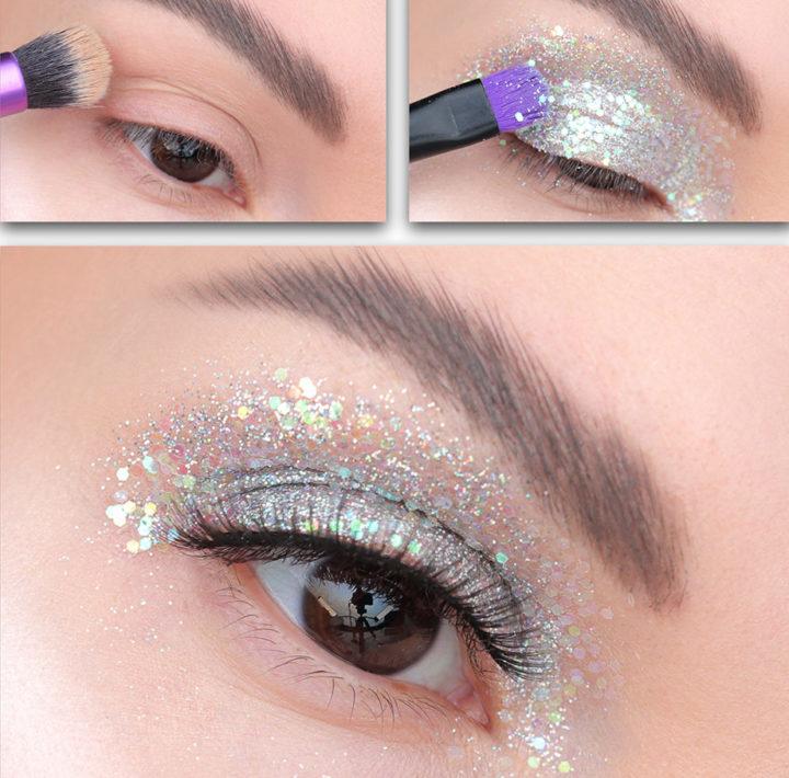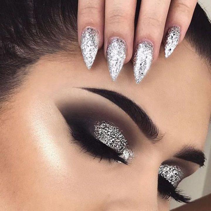 Les options les plus brillantes qui vous conviennent pour les vacances du Nouvel An sont les ombres argentées avec des paillettes. Ils contiennent des grains d’argent brillants, qui rendront votre look particulièrement expressif.