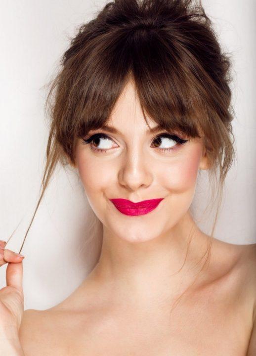 Ensuite, passez au maquillage des yeux. Vous ne pouvez utiliser que du fard à paupières et du mascara, ou vous pouvez utiliser du mascara et un eye-liner. Dans notre cas, il s’agit d’une petite flèche, qui est dessinée le long de la paupière supérieure le long des cils. Teignez les cils avec du mascara, mais pas abondamment, puis passez aux lèvres.
