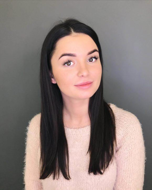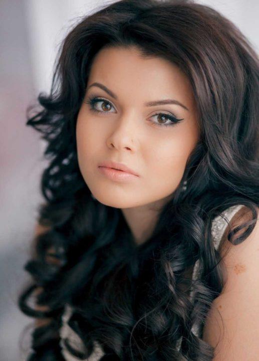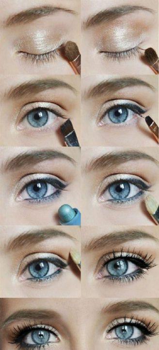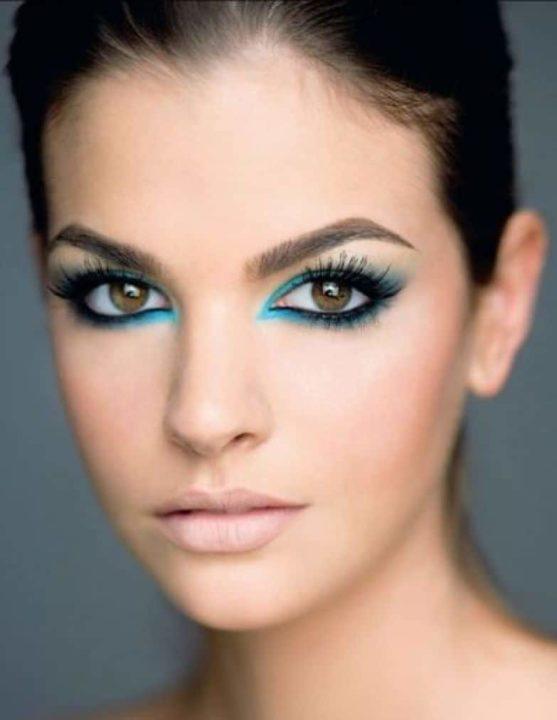 Une beauté plutôt rare – une brune aux yeux bleus, mais il y en a. Les ombres rose foncé, blanches et nacrées sont les meilleures pour vous. Et aussi la technique d’application du maquillage Northern Lights.