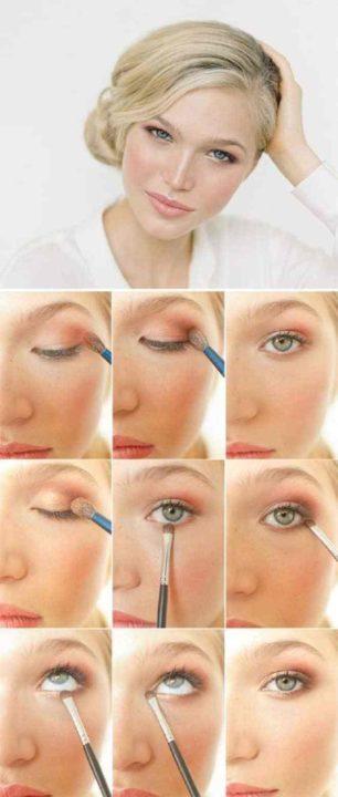 Des ombres lumineuses et colorées avec des reflets chatoyants – mettront parfaitement en valeur vos yeux. Ils deviendront un peu plus grands et la couleur des ombres sélectionnées mettra parfaitement en valeur la couleur de vos yeux. Vous pouvez également ajouter des ombres claires dans le coin interne de l’œil, ce qui rendra certainement vos yeux plus grands.