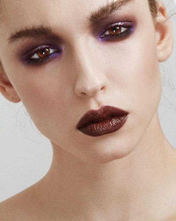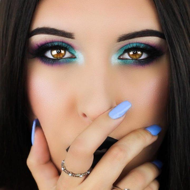 Bien qu’il soit également permis d’utiliser des couleurs froides et saturées telles que le cyan ou le bleu. Ils doivent mettre en évidence le coin interne des paupières supérieures et inférieures, mais teinter le reste de la paupière mobile en violet foncé.