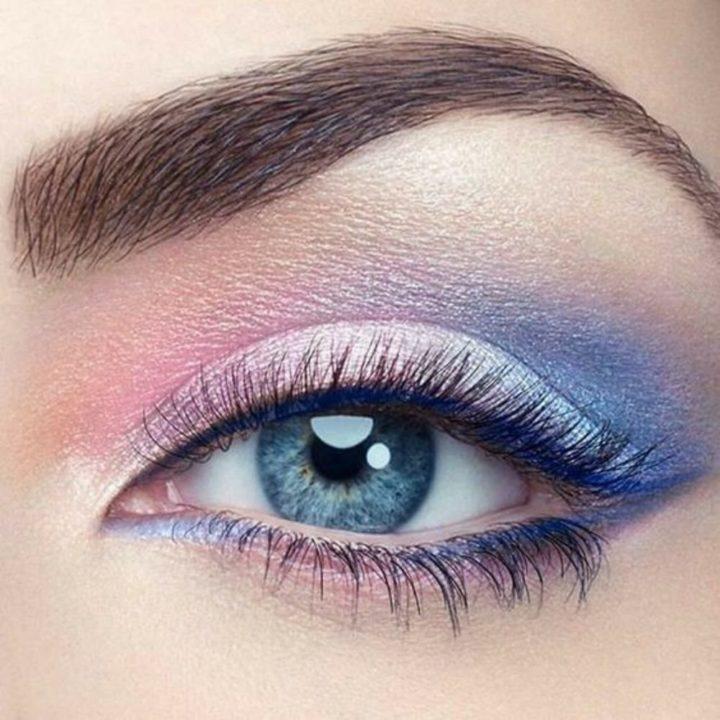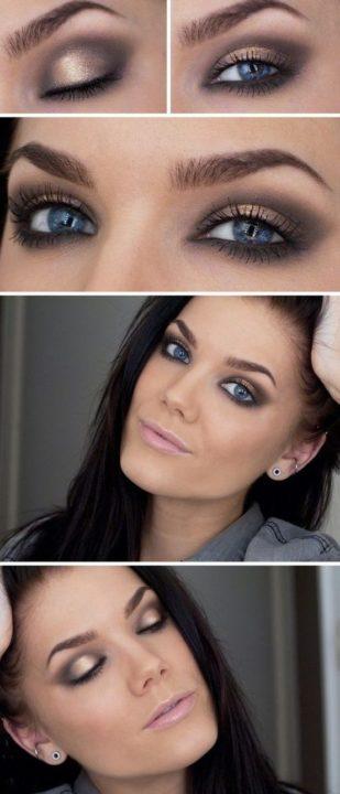Le maquillage fumé fonctionne très bien pour les yeux bleus. Dans ce tandem, vous pouvez combiner le blanc et le bleu, la perle et le violet, la perle et le noir, le lilas et le violet et d’autres.