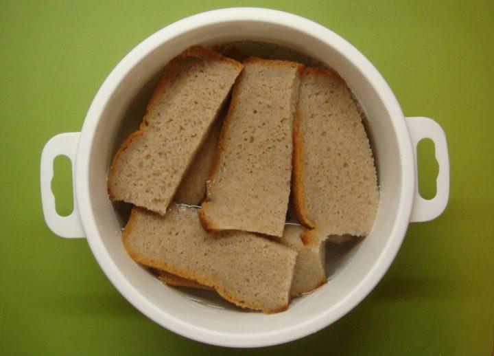 Pour la cuisson, prenez une demi-miche de pain noir, faites-la tremper dans 1 litre. eau chaude pendant deux heures.