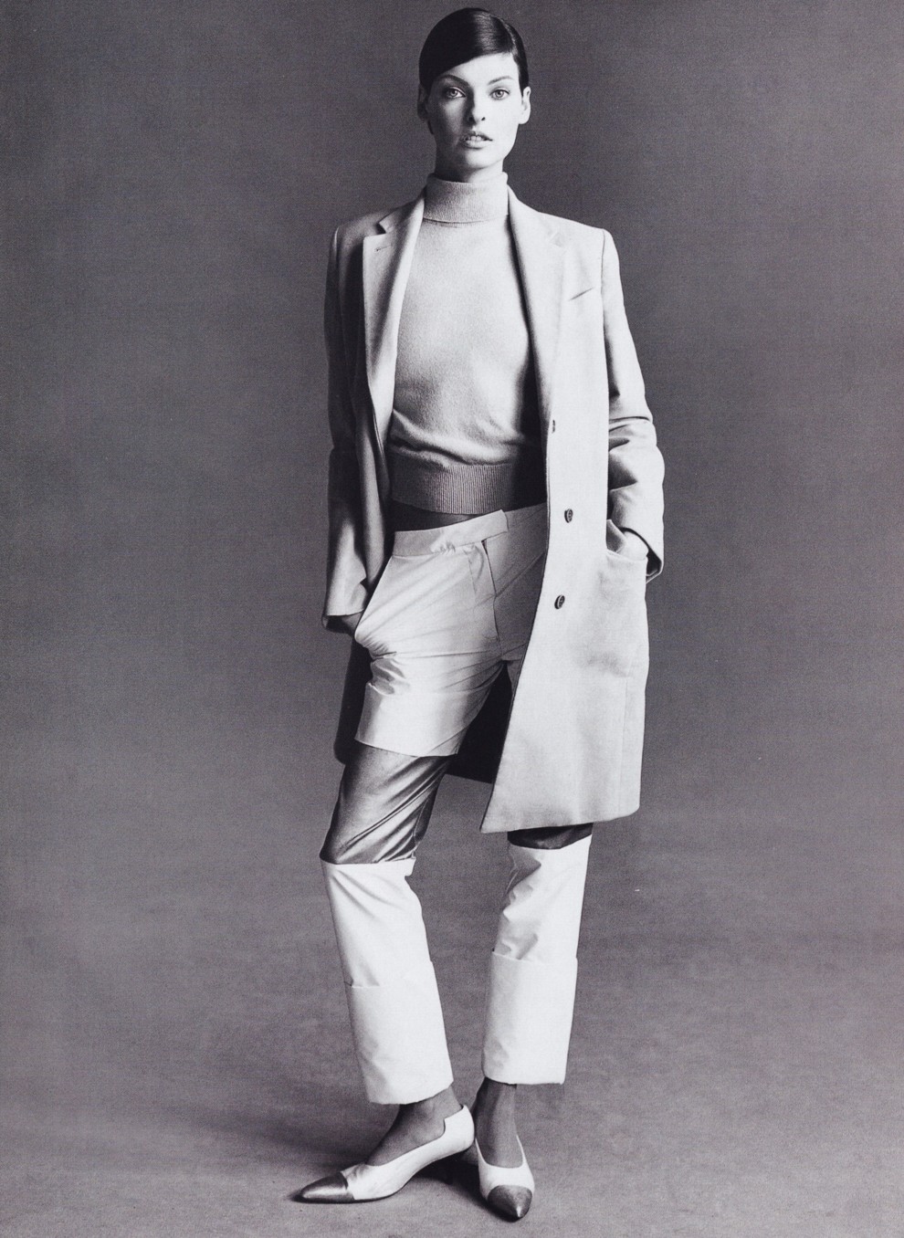 L’impulsion décisive dans la popularisation de la mode du minimalisme a été la lutte pour l’égalité des sexes dans les années 80. La tendance a été reprise par le designer Helmut Lang, qui dans les années 90 a choqué le public avec des modèles en tailleur-pantalon et en t-shirt au lieu d’une chemise.