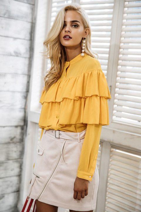 Les chemisiers jaunes capturent l’été 2021 et permettent à chaque femme de mettre en valeur sa silhouette avec une couleur aussi ensoleillée. Le jaune ne gonfle pas et ne s’élargit pas, ce qui permet à toute femme de s’habiller dans une teinte similaire.