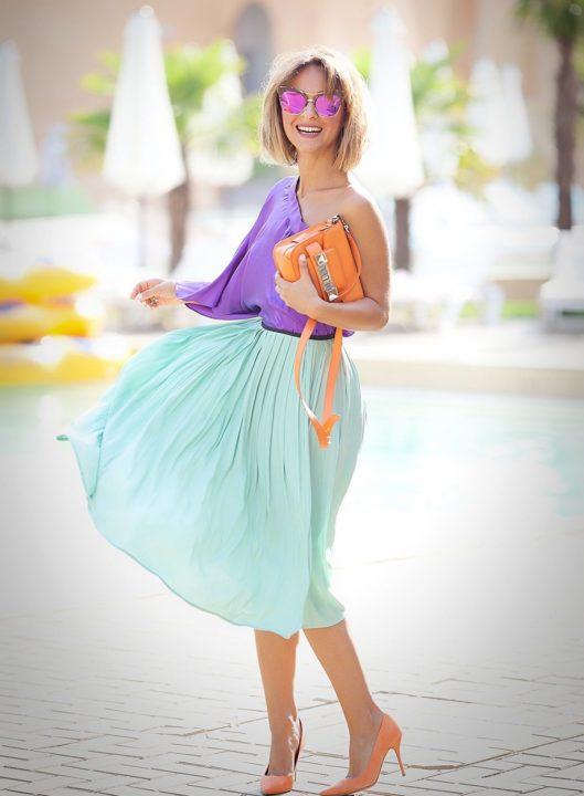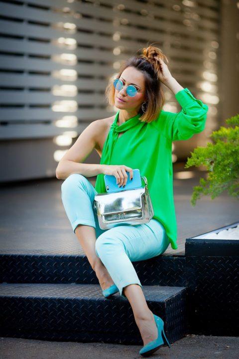 Colorblock est une grande capacité à combiner différentes couleurs dans les vêtements, ce qui crée un arc harmonieux dans un tandem commun. Il existe deux options pour les vêtements de style bloc de couleurs: la première est des vêtements prêts à l’emploi de différentes couleurs, la seconde est une sélection indépendante d’objets monochromes de différentes couleurs (par exemple, une jupe jaune, des chaussures vertes et une veste).