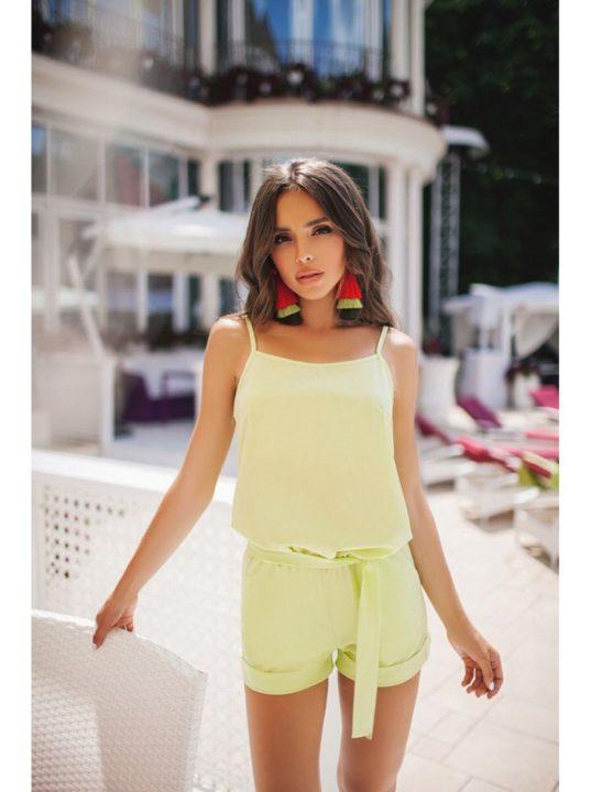 Au lieu de la version standard avec un pantalon, vous pouvez choisir une combinaison avec un short. Cette option plaira à de nombreuses fashionistas et peut magnifiquement mettre en valeur les jambes élancées et bronzées. Des chaussures à talons hauts et des sandales basses peuvent être portées sous la salopette.