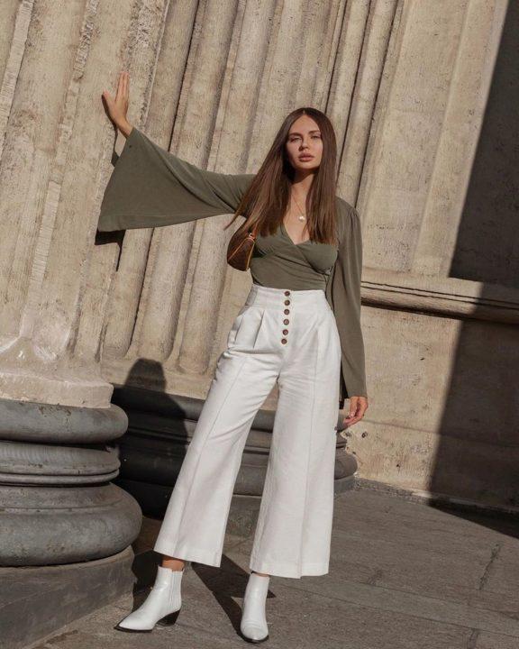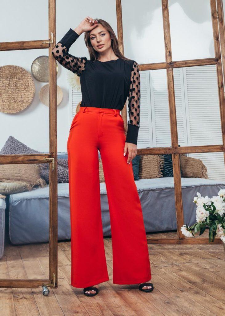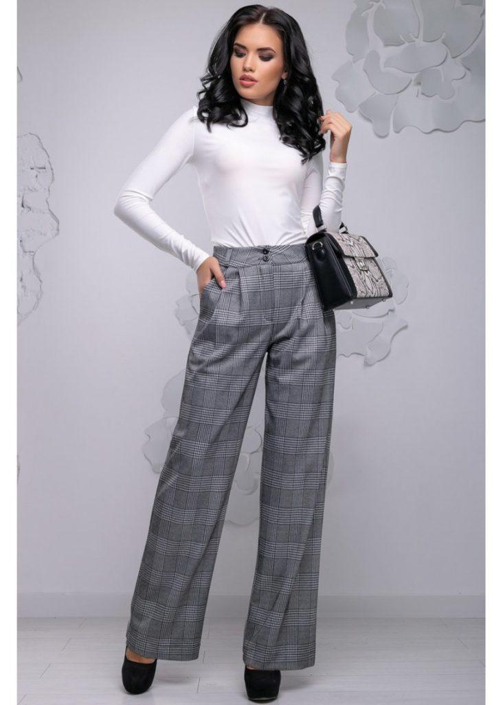 Les coupes larges seront le meilleur choix pour les beautés grandes et minces. Les femmes de petite taille devraient refuser de tels styles. Ils trahiront un volume inutile. Mais les grandes femmes ont pu combiner habilement de tels pantalons dans leur garde-robe. Ils sont associés à un top boxy. Une telle tenue corrigera la silhouette, une coupe large masquera les grandes hanches et affinera vos jambes. L’achèvement efficace de l’image sera, les talons trahiront l’élégance de l’image.