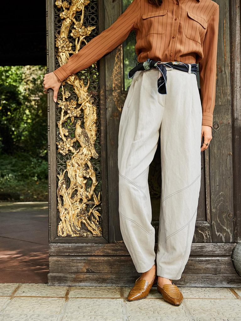 L’une des choses les plus intéressantes dans la garde-robe d’une femme est le pantalon banane. Ce modèle a de nombreux styles différents. Ce qui permet de créer des tenues uniques. Mais le modèle de coupe droite avec des plis est plus pertinent. Il n’est pas large au niveau des hanches, il s’adapte donc bien à tout type de silhouette. Extérieurement, le pantalon est ovale, taille moyenne. Avec une partie large au niveau des hanches et rétrécie vers le bas. Il y a des plis sur la ceinture qui ajoutent du volume.