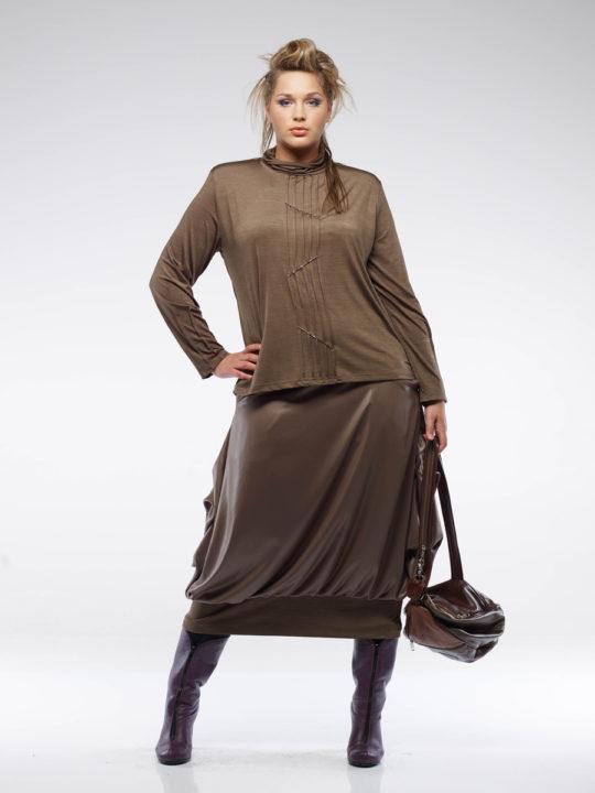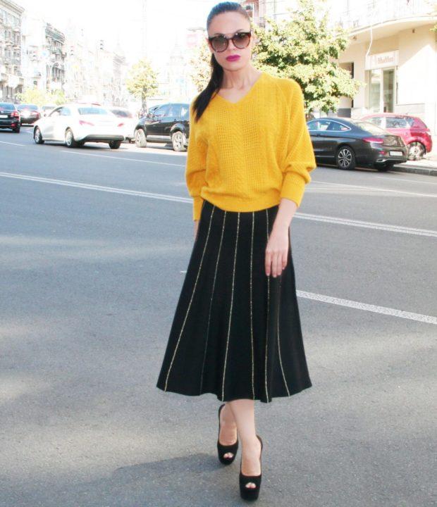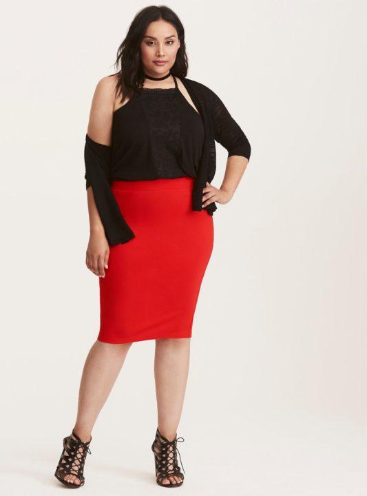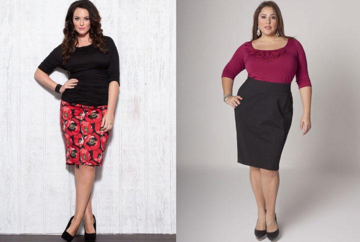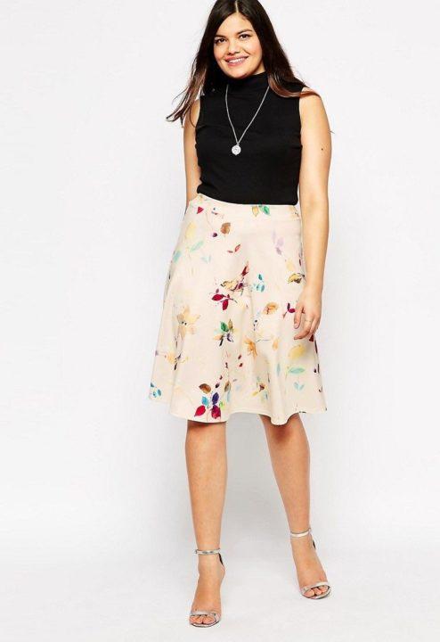 Une jupe trapèze a le même effet sur une silhouette de type pomme qu’une robe trapèze. Il régule la silhouette entière dans son ensemble, tout en étirant visuellement votre taille. Par conséquent, si vous êtes petit, portez une jupe trapèze sous les talons, et vous deviendrez beaucoup plus grand, grâce à la coupe spéciale de la jupe et bien sûr du talon.