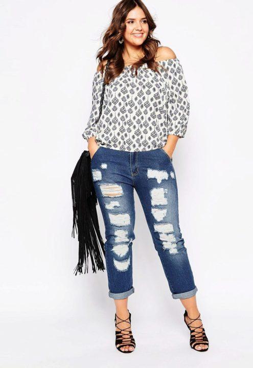 Le jean boyfriend est un modèle très élégant et à la mode qui s’adaptera parfaitement au type de corps de pomme. Ces jeans sont disponibles en différentes longueurs, où chacun conviendra bien à votre silhouette. Mais la meilleure option serait de choisir des modèles raccourcis. Ils peuvent être avec des trous, des patchs, des strass ou des inscriptions.