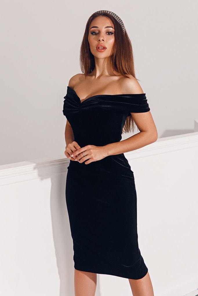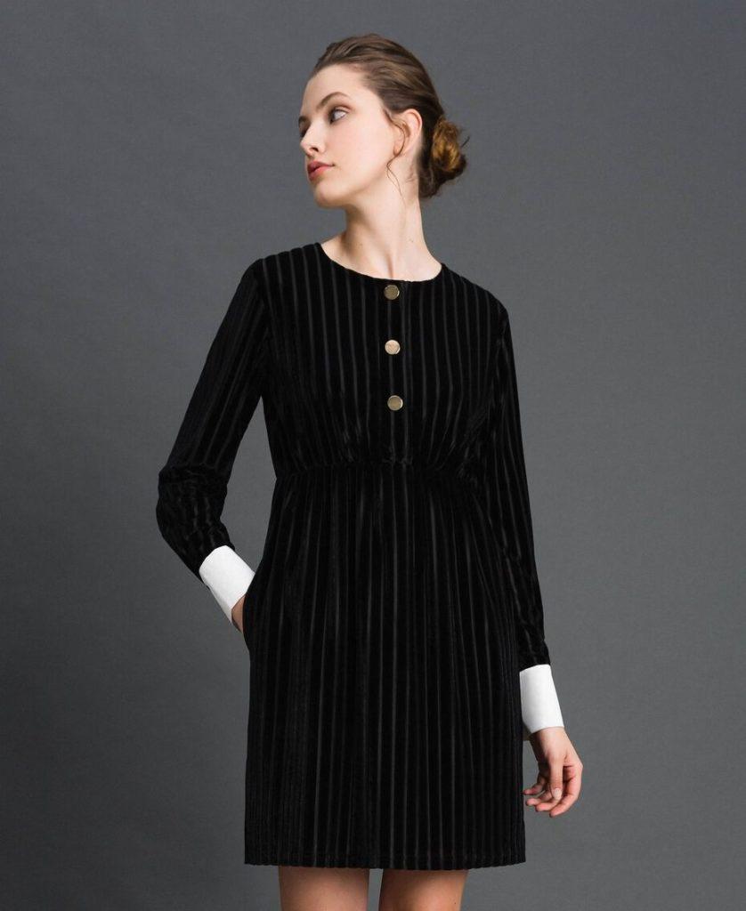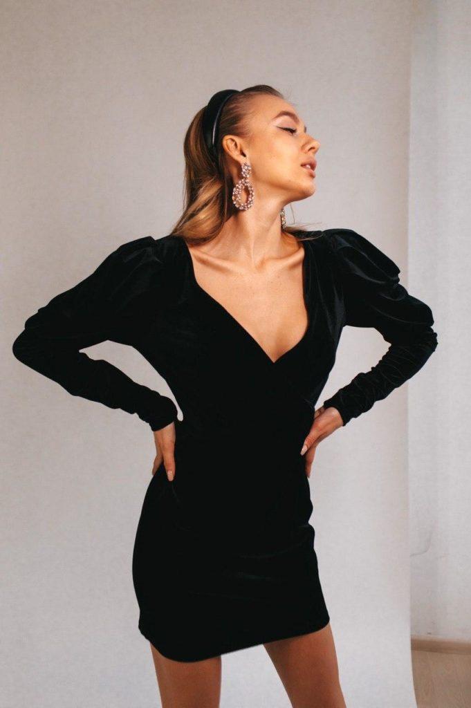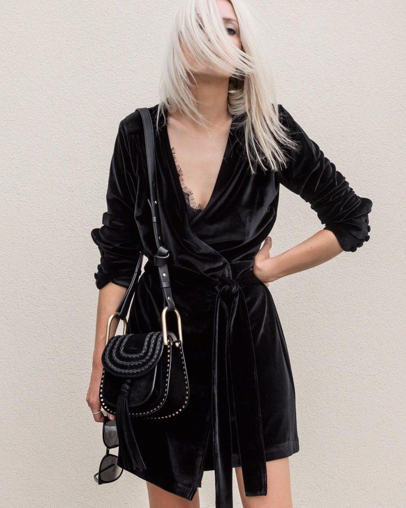 Une tenue en velours a l’air chère et sophistiquée. Et une robe noire faite d’un tel matériau aura un chic particulier. Mais il convient de noter que le velours brille légèrement, il peut donc ajouter visuellement du volume inutile aux formes courbes. Par conséquent, les grandes femmes devraient refuser de telles robes. Des bijoux en perles soignés seront un complément idéal à une robe en velours.