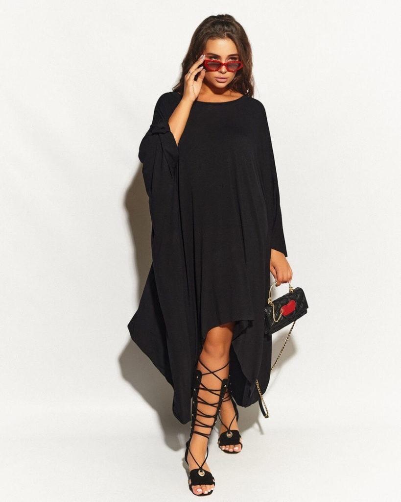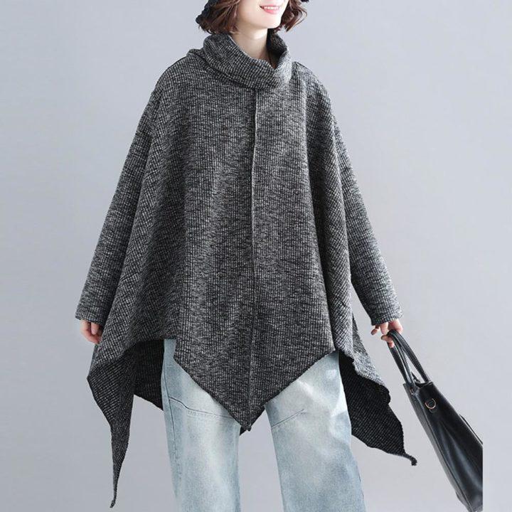 La robe poncho a l’air extravagante. C’est un modèle qui ne nécessite pas d’ajouts, mais qui se porte comme une tenue autonome. Il a des fentes pour les bras ou une manche, ainsi qu’un décolleté. Une pièce, pas de boutons. Cette coupe dissimule parfaitement les imperfections et affine la silhouette.