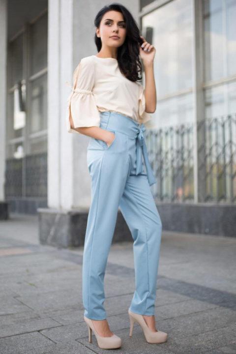 Les pantalons, mais pas les jeans, seront à la mode à l’été 2019. Le style du pantalon lui-même peut être n’importe quel, ici, vous devriez déjà commencer à partir de votre silhouette. Pour cacher un problème de ventre, choisissez des modèles à taille haute et un pantalon droit classique vous aidera à allonger visuellement vos jambes.