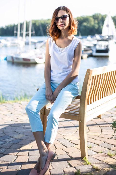 L’essentiel est d’essayer de sélectionner votre bas dans une couleur unie, car dans votre image, il y a déjà un détail lumineux: un chemisier.