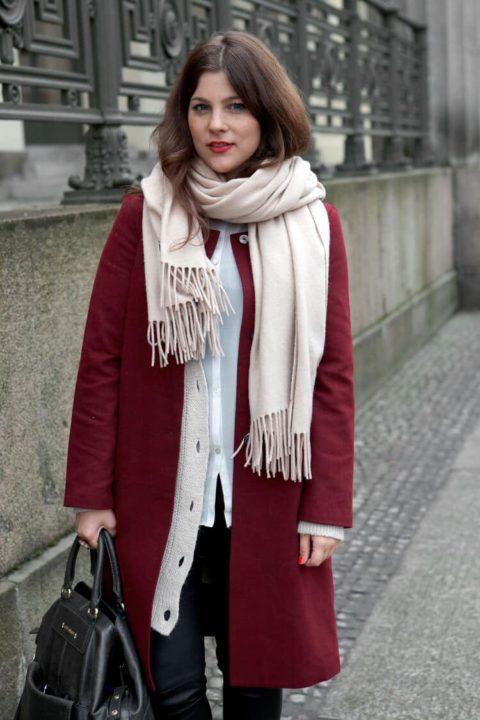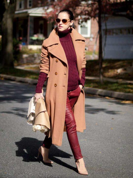 Avec la couleur bordeaux, vous pouvez combiner les mêmes choses bordeaux, uniquement avec une différence d’un ton. Les couleurs noir, gris, blanc et sable sont idéales pour cela.