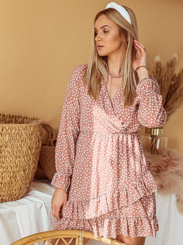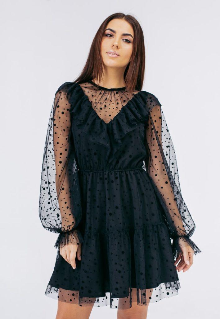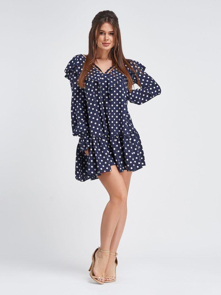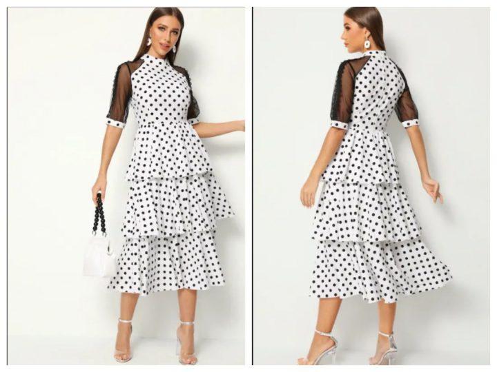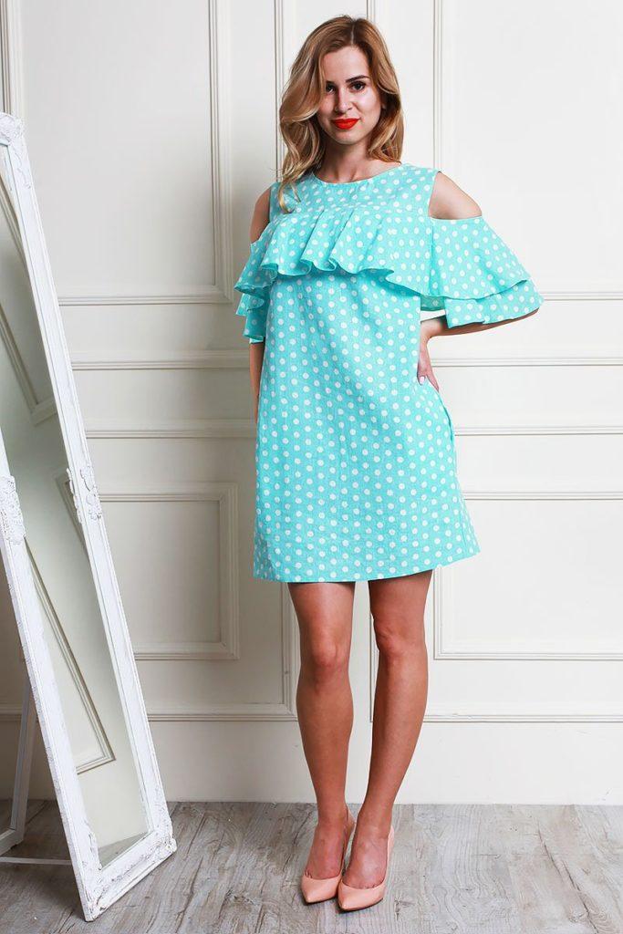 Une robe à volants est associée à la légèreté et à l’insouciance et au style jeune. Et la combinaison d’un tel décor avec une robe à pois lui donne de la tendresse et de la sophistication.