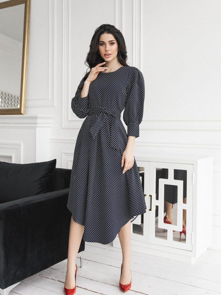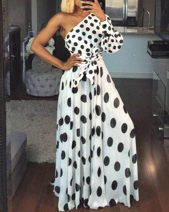 La coupe asymétrique originale de la robe à pois ajoutera de l’originalité à votre image. Et aussi ce style aidera à corriger la figure. Le modèle long a l’air intéressant avec une manche sur une épaule. Et aussi l’ourlet asymétrique donne de l’originalité à ce style.
