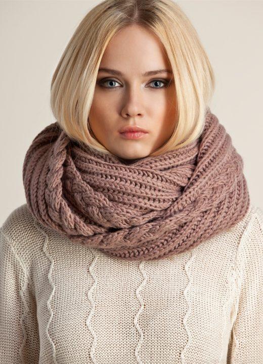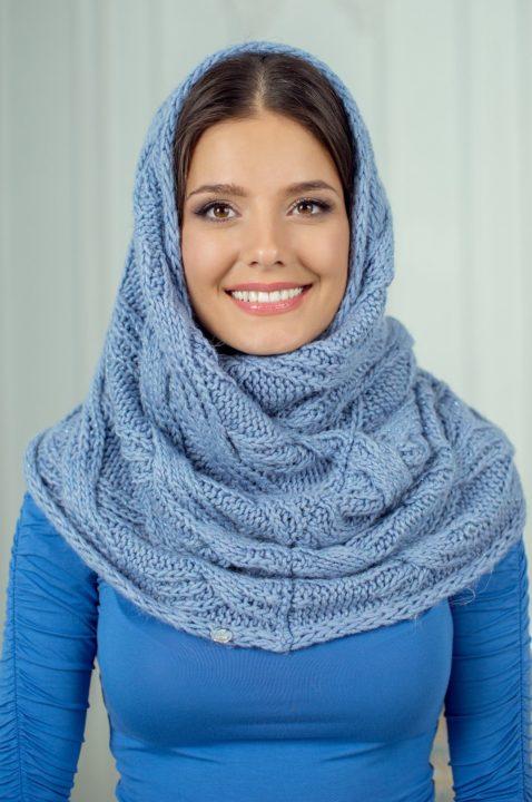 Ici, le snood est noué autour du cou, un anneau est créé avec lequel la tête est couverte. En conséquence, il semble qu’au lieu d’une écharpe, une écharpe tricotée soit utilisée ici. Pour ce type de chaussettes, vous devez acheter un snood assez large et long.
