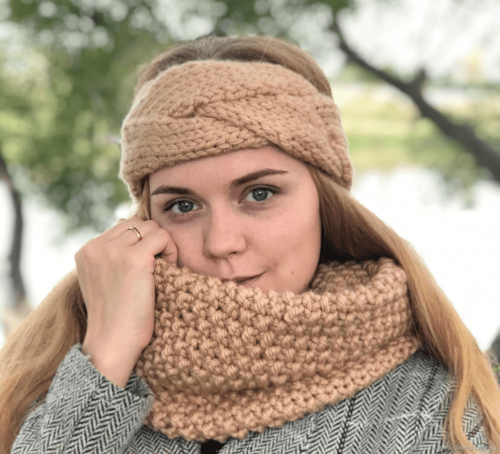 Ici, vous devez enrouler la longue corde principale autour de votre cou et en mettre une partie sur votre tête, sous la forme d’un bandage. Vous pouvez ajuster la largeur de la toile à votre guise. Cela aidera à réchauffer votre gorge et votre tête pendant le gel sans porter de chapeau.