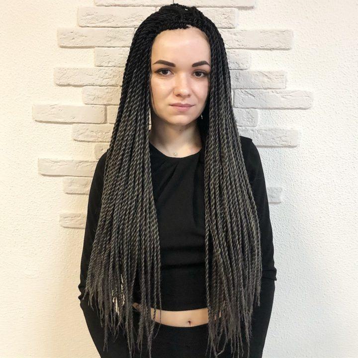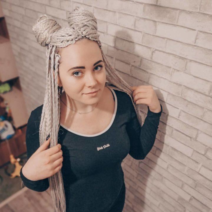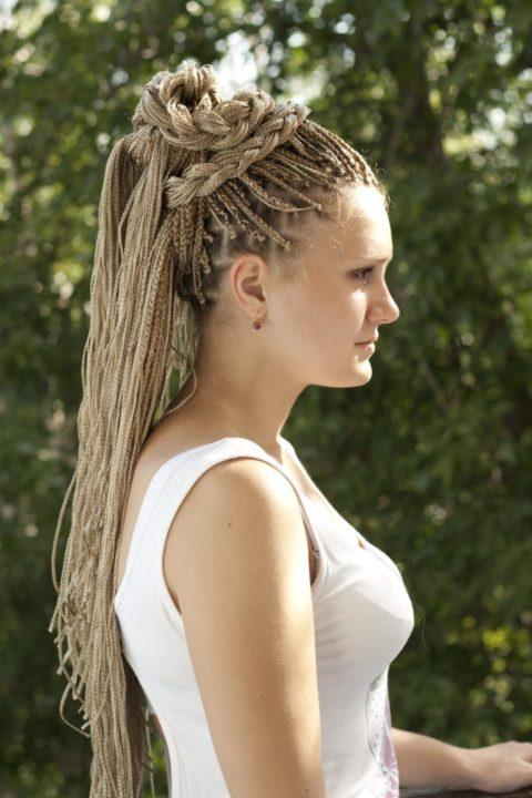 Les cheveux blonds blonds sont très beaux dans les tresses zizi. L’essentiel est de ne pas choisir de brins de couleur foncée pour eux. Ils auront l’air sales avec eux.