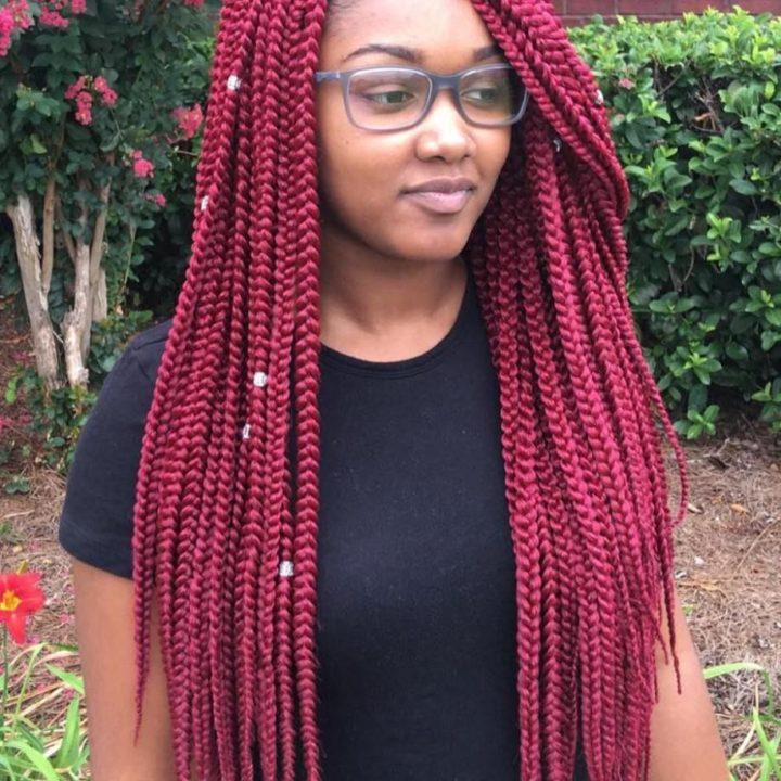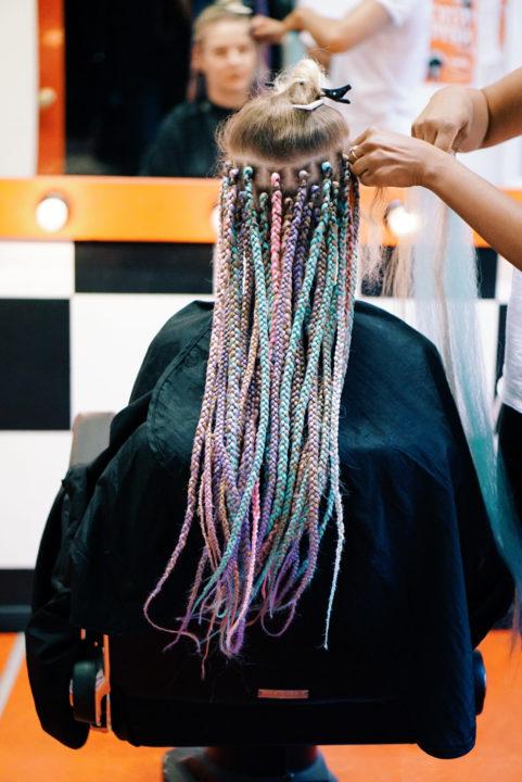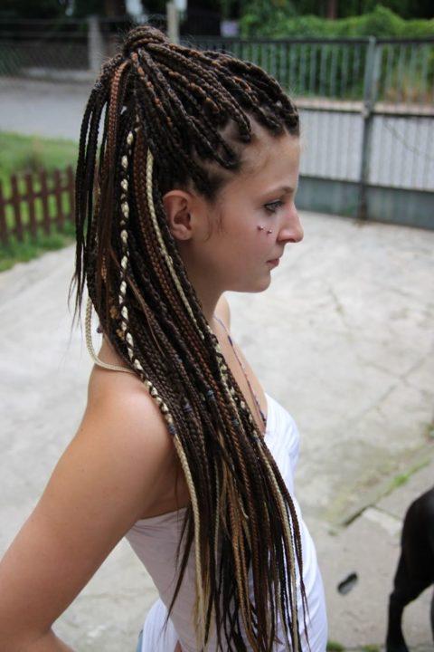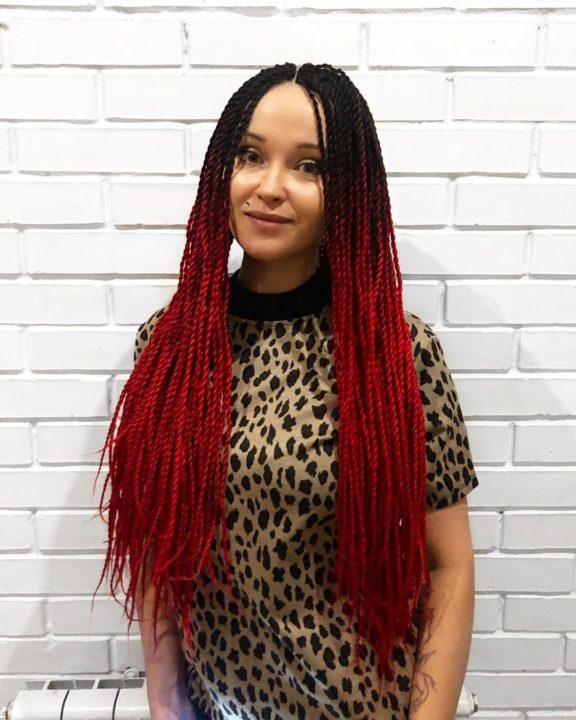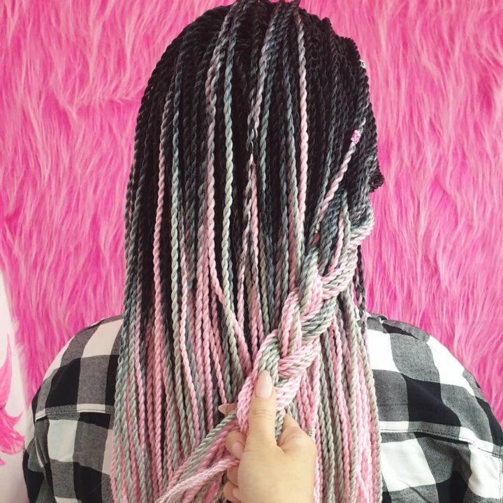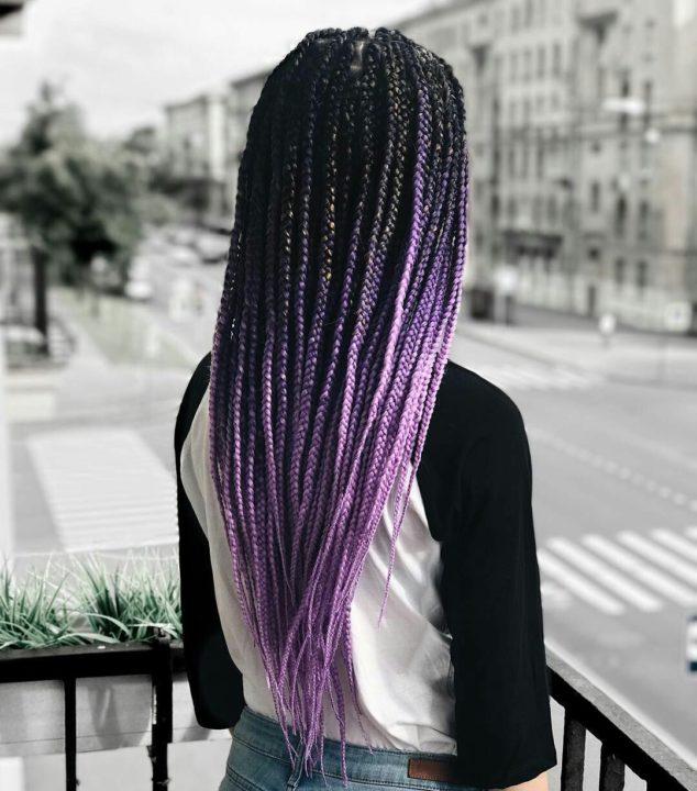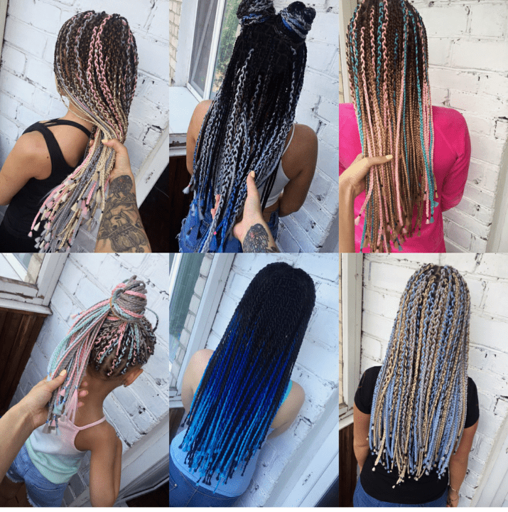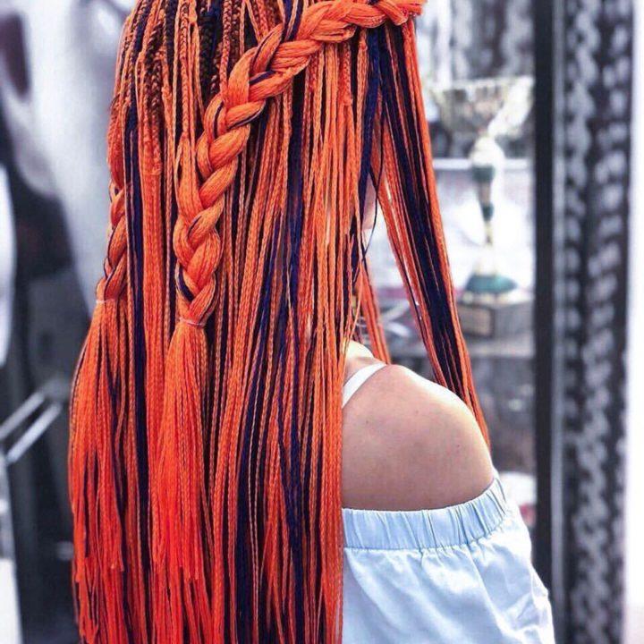 L’option la plus courante pour tisser des tresses zizi est avec des brins multicolores. Différentes couleurs sont utilisées ici: violet, orange, rose, bleu. Personne! Surtout si vous préférez le style de la rue dans les vêtements, cela a l’air super.