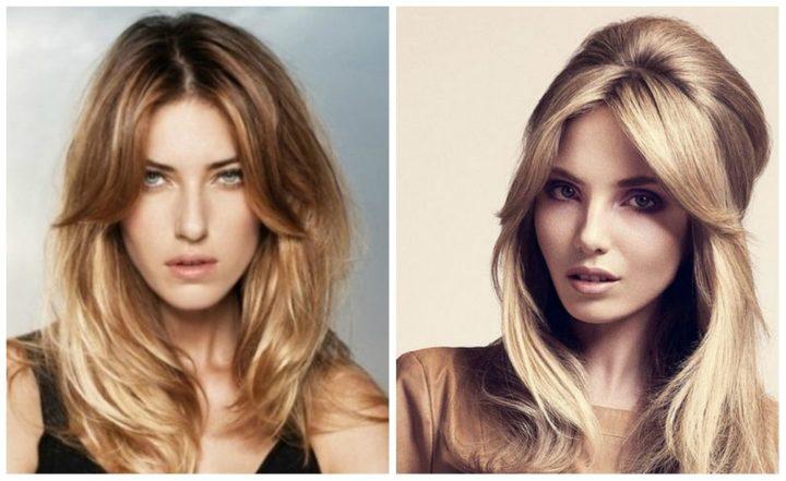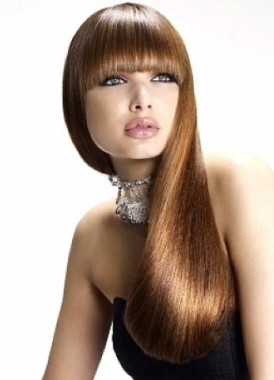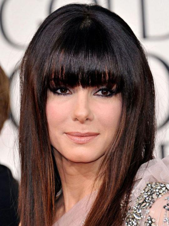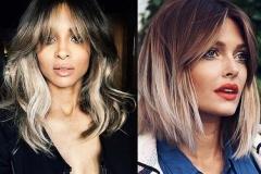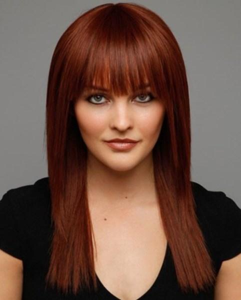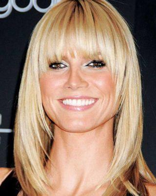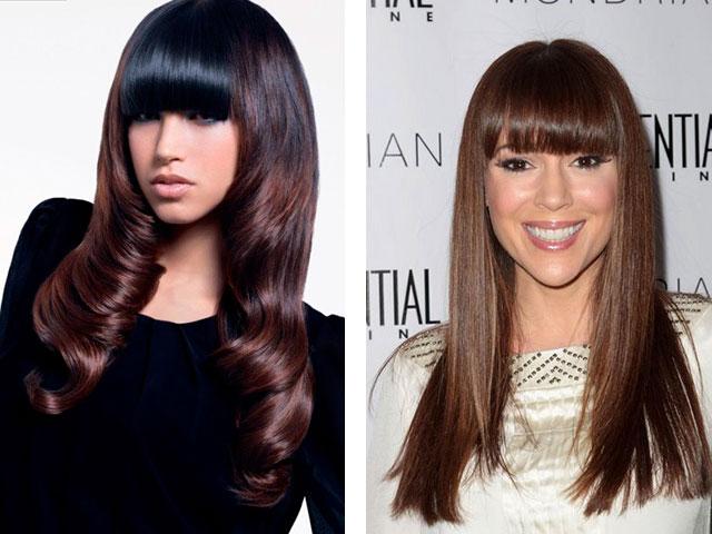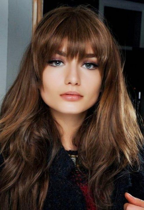 Les coupes de cheveux avec une longue frange conviennent aux femmes au front haut. Il peut être porté droit ou sur le côté, la seule condition est qu’il soit épais. Les longues franges sont portées par des beautés aux formes de visage différentes, surtout si vous devez créer l’effet d’un ovale de visage allongé.