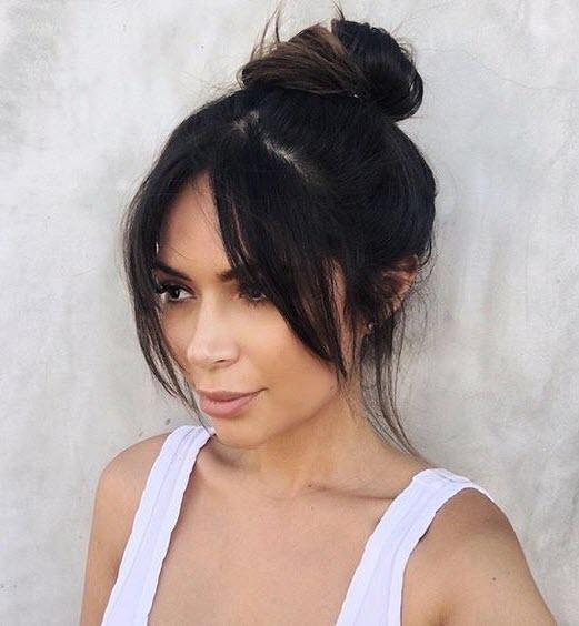 - Un visage allongé sera transformé par une frange épaisse et uniformément coupée, longue jusqu’aux sourcils.