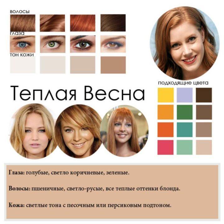 La peau est également claire, mais avec une nuance chaude. Il peut être légèrement pêche ou miellé. La couleur des yeux peut être brune avec une teinte miel, noisette, gris, bleu-gris. En outre, des taches de rousseur peuvent souvent être trouvées sur le visage des filles comme le printemps.