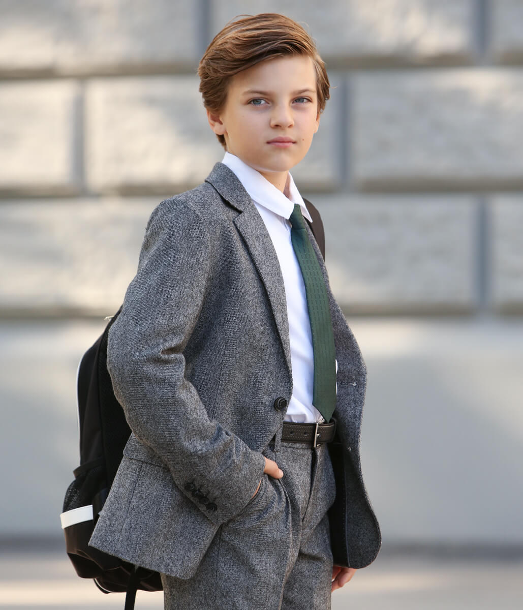 Les costumes d’affaires n’abandonnent pas leurs positions, dont les styles modernes seront appréciés à la fois par les écoliers plus âgés et les élèves du primaire. Le complément parfait à un look aussi élégant sera une chemise unie ou à carreaux, et plus le motif est brillant dans ce cas, plus les regards admiratifs de camarades de classe que votre homme recevra. Lors du choix d’une palette de couleurs, selon les stylistes, il convient de privilégier une teinte bleu foncé, marron foncé ou cerise. La malachite, le fuchsia et toutes les nuances de gris, du sombre au clair, sont également très pertinentes.